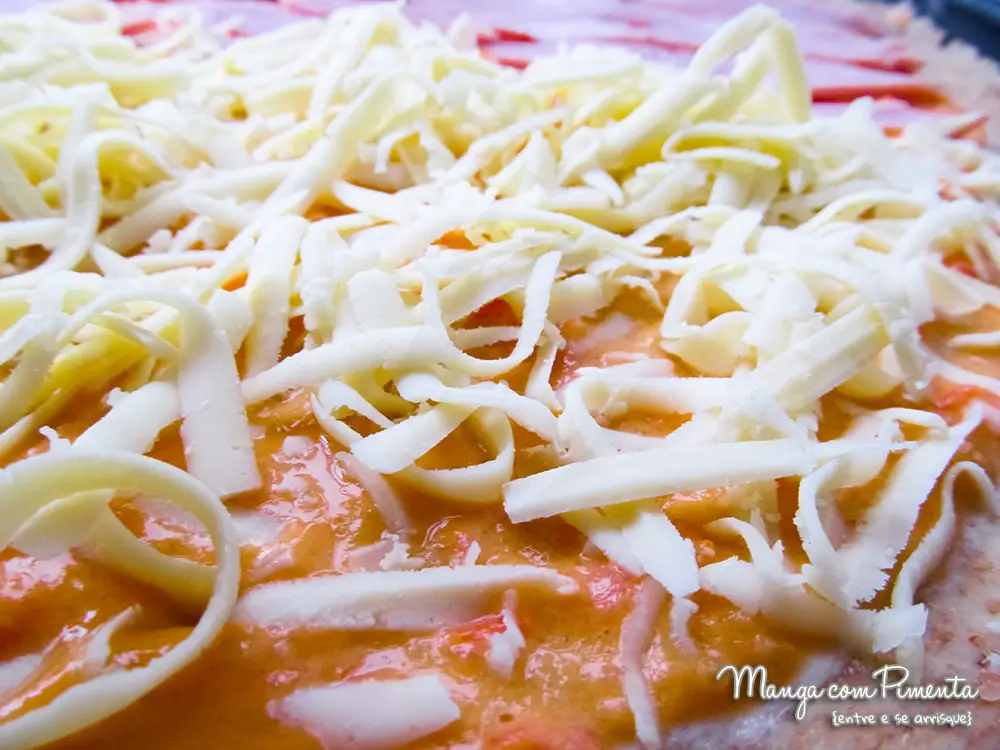 O recheio da pizza foi de queijo de muçarela (normal mesmo, não me condenem!!) com folhas de manjericão.