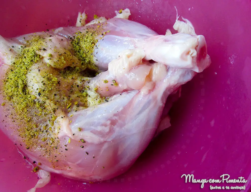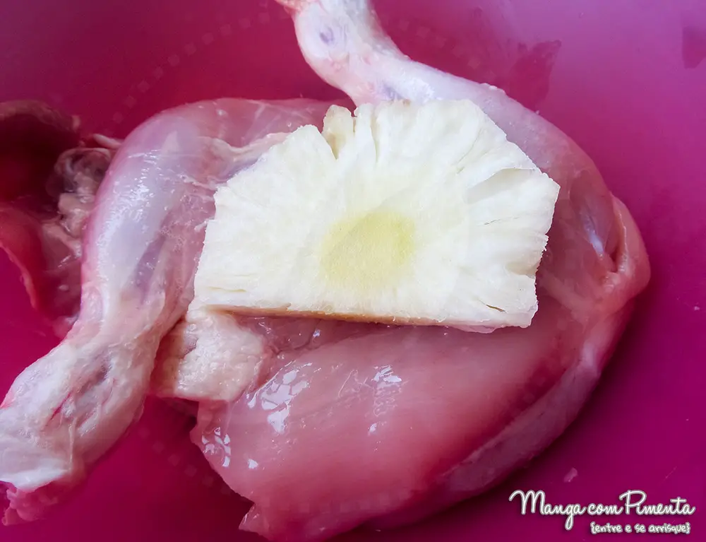 - Em pote com tampa ou um saco plástico culinário coloque as coxas de frango, o suco de abacaxi, tempere com sal e pimenta do reino.
