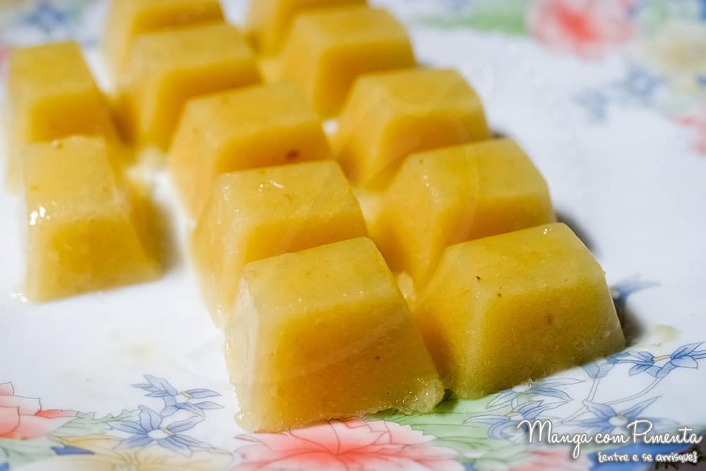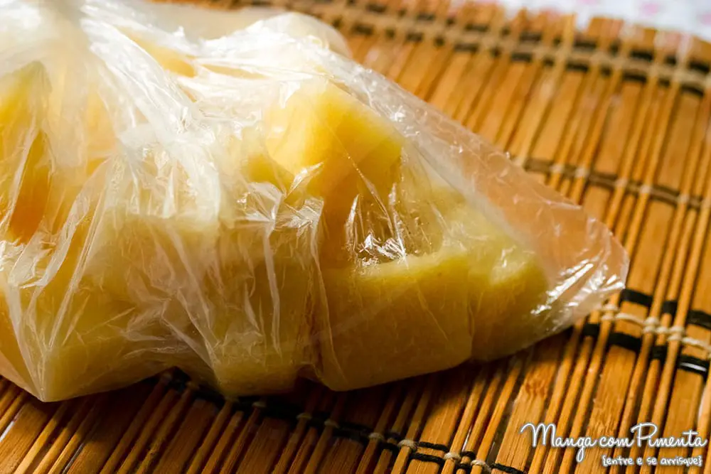 Corte a polpa da fruta em cubos e triture no liqüidificador ou mixer.